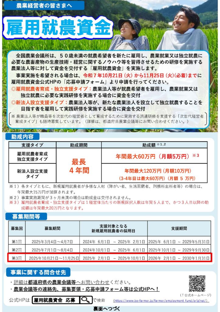 雇用就農資金 令和7年度第3回募集【10/21~11/25】